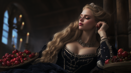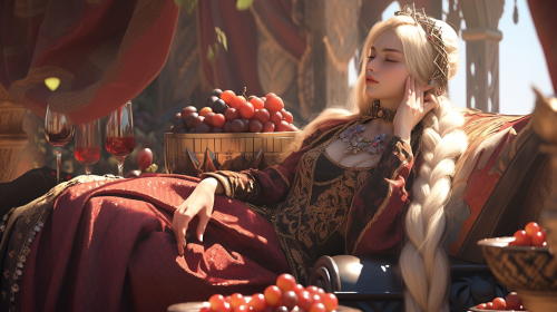 photorealistic movie still of Avril lavigne as a saucy medieval courtesan lounging eating grapes and cherries , elizabethan clothes, full chest, UHD 4K, ultrarealism, cinematic lighting, photorealism --ar 16:9 --niji 5