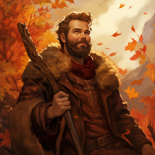 a bearded, lanthanic character with a long staff, in the style of warm color palette, furry art, magali villeneuve, alex hirsch, thick paint, cabincore, basil gogos