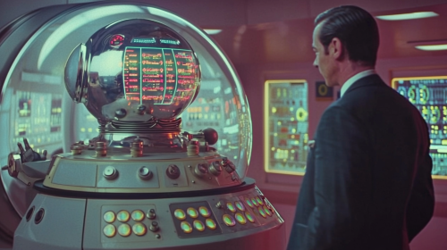 vintage photograph of 1950s retro-futuristic office scene featuring a professional in classic business attire standing beside a friendly, chrome-plated robot assistant. The professional and robot gaze thoughtfully at a large, dome-like screen displaying colorful, neon-lit graphics: gears, data charts, AI symbols, and workflow diagrams. The room has vintage touches like rotary phones, rounded computer monitors with glowing dials, and a control panel with colorful buttons. Vintage design elements like pastel colors, metallic finishes, and soft, glowing lights would enhance the scene’s retro-futuristic look., --v 6.1 --ar 16:9 --q 2