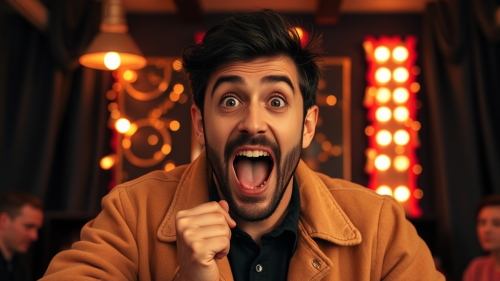 An angry DJ on stage at a concert with only a laptop in front of him. There is an empty speech bubble above his head. Crowd in the foreground, realistic 4k