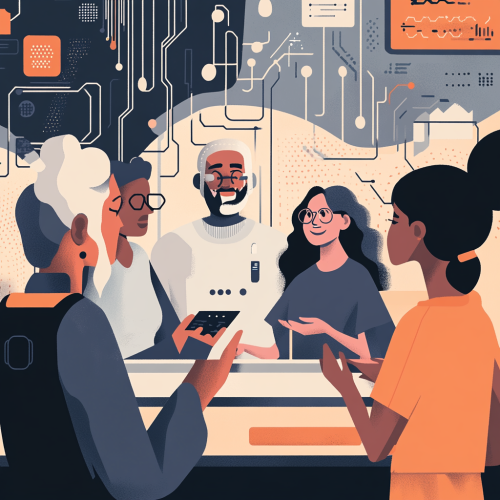 The scene shows a diverse group of customers in a friendly, inviting setting, interacting with a smart AI assistant that is attentively listening and understanding their needs. The background features subtle technological elements like circuits or data patterns, but these are secondary to the warm, human-centered atmosphere. The AI assistant is represented as approachable and empathetic, emphasizing a customer-centric approach over complex technology.