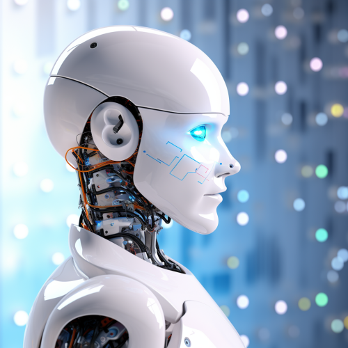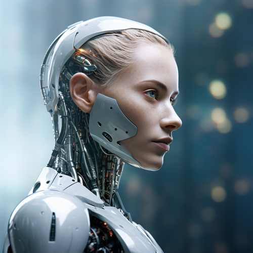commercial branded image depicting a picture of an ai human robot on the side of the image, friendly and intelligent look and design, fading edges disipating into the backdrop of the image, high quality render, octane render, ultra realisim