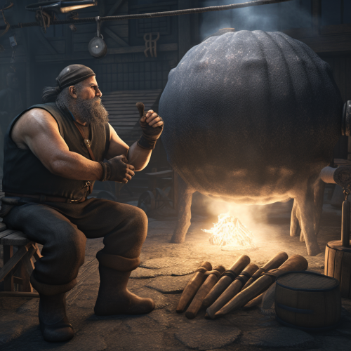 a photorealistic image of a dirty, gritty blacksmith who is hitting a speech bubble on the anvil with his hammer, but the speech bubble is made of steel, and there's a fire kiln burning in the background --v 5.0