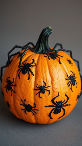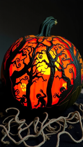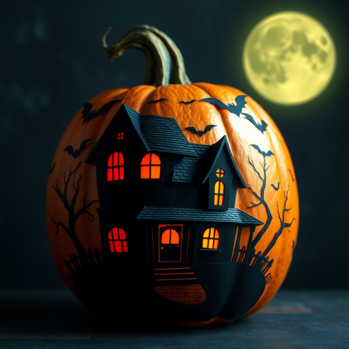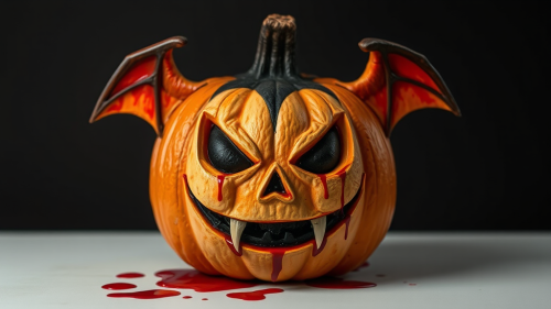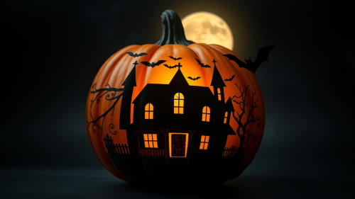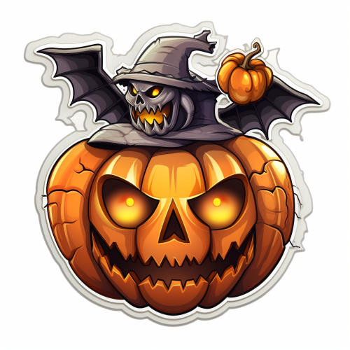 a cartoon sticker of a halloween pumpkin with a skeleton and bats, spooky looking, 2d, vector illustration, white background