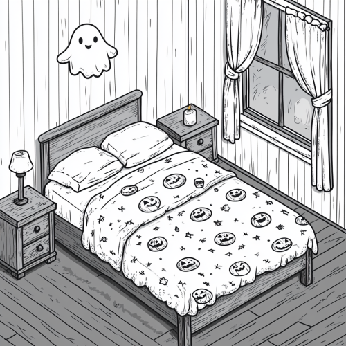 Simple and basic vector line art of a cozy, cute Halloween bedroom in isometric view, with a bed covered in pumpkin-patterned blankets, a nightstand with a candle, and a friendly ghost hovering near the window, designed for a coloring book that does not look like it’s AI-generated, no color.