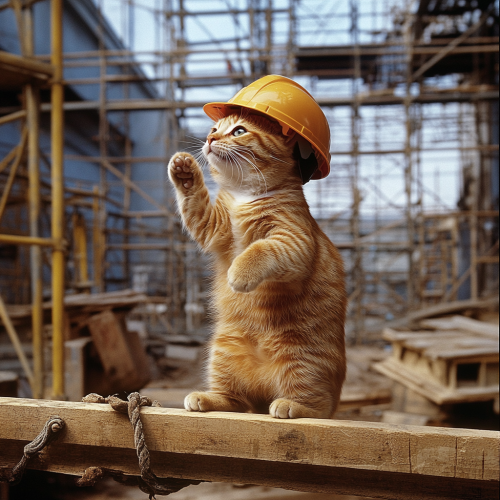 A robust and hardworking cat on a construction site, wearing a safety helmet and showing off impressive muscles. The cat is engaged in a task such as lifting a heavy beam or operating machinery, looking focused and determined. The construction site is bustling with activity, featuring scaffolding, tools, and building materials. The cat’s strong physique and serious expression highlight its dedication and strength, making it a standout figure in the busy, industrious environment.