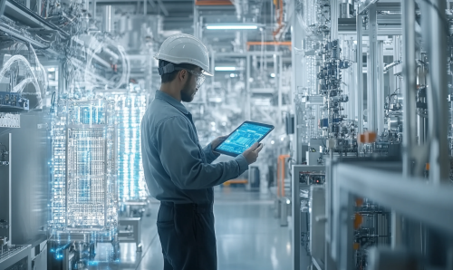 A man in a semiconductor factory, wearing a safety helmet and work clothes, holding a device similar to an iPad while standing in the workspace. The scene is highly detailed and realistic, with various semiconductor machines and equipment in the background. The workshop is brightly lit and well-organized, emphasizing a modern industrial setting. photorealistic, --ar 5:3 --v 6.1