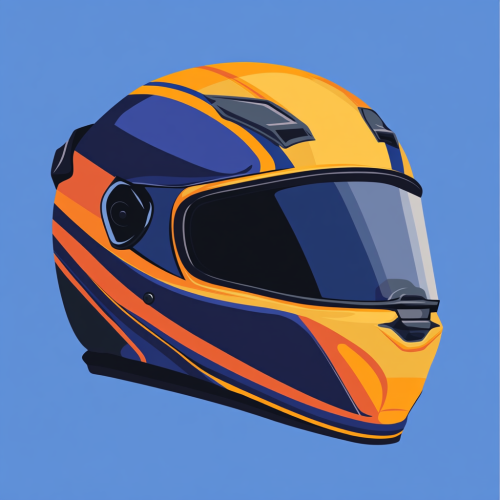 flat vector illustration of a motorcyclist helmet. This flat design is suitable for a motorcycle safety class print advertisement poster or banner template, isolated on a blue background. Flat vector illustration of a motorbike helmet and semantic elements. no text, isolated element for web or graphic design, simple, minimalist. Colors are navy, blue, orange and safety yellow. --ar 1:1