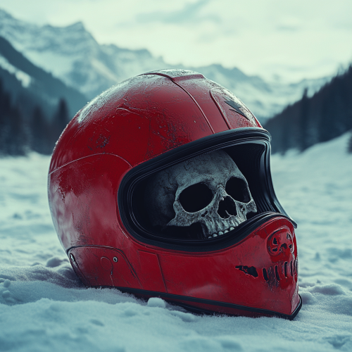 Low angle close-up of a red motorcycle helmet, with a skeleton head inside of it, sitting in the snow in a frigid mountainous landscape. In the style of David Fincher. Dark, moody, atmospheric, cinematic. 35mm filmstock. --ar 1:1