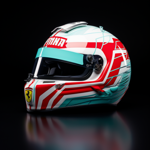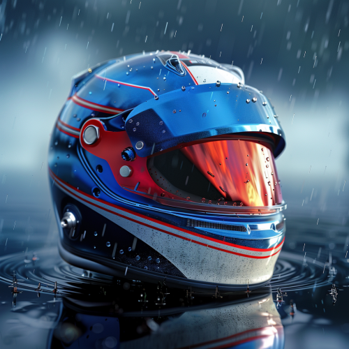 helmet for car racing, helmet color blue and white, visor is red mirror, under rain
