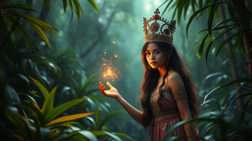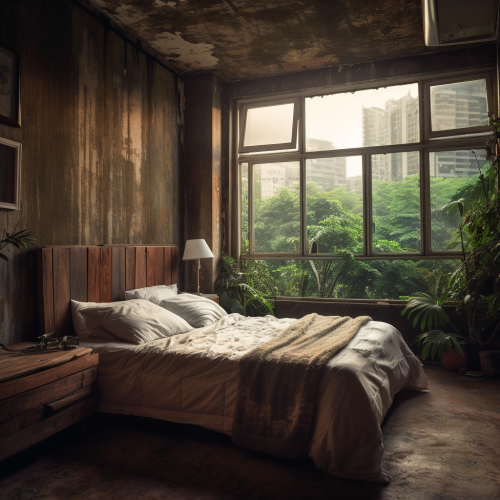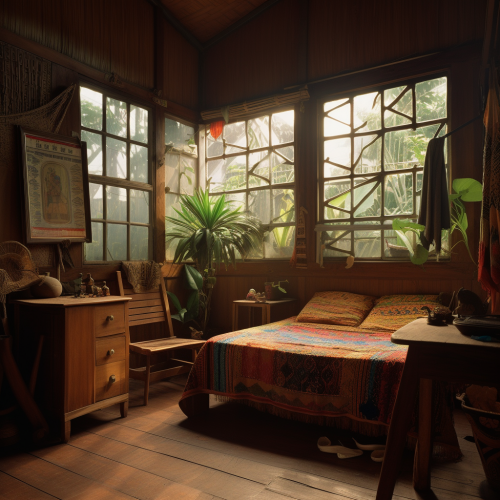 A cozy bedroom on the top floor of a four-story building in an ancient, industrial jungle city with a humid subtropical climate. Rain pours outside, visible through large windows that overlook the dense jungle and ancient, weathered buildings below. The city’s architecture blends indigenous American, particularly Amazonian, heritage with subtle, rustic industrial elements. The room features rough-hewn wood, woven fibers, and vibrant handwoven textiles, with ancient symbols softly glowing on the walls. The atmosphere is warm and inviting, capturing a timeless blend of urban life and deep connection to the surrounding lush environment. --v 5.0
