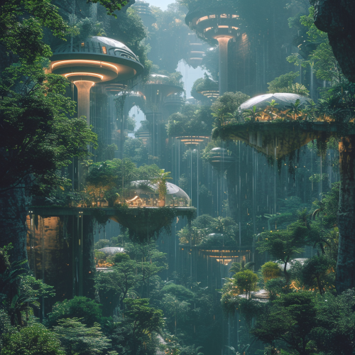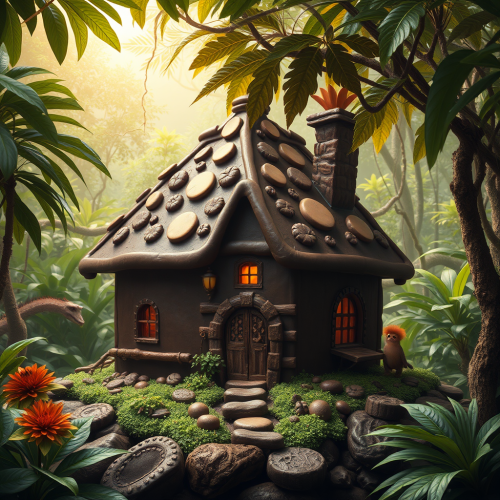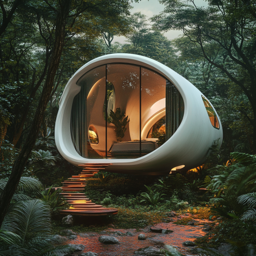 a tiny house on a budget in the middle of the jungle, the shape of the house is futuristic, based in the year 2400 when everything is differet than we imagine