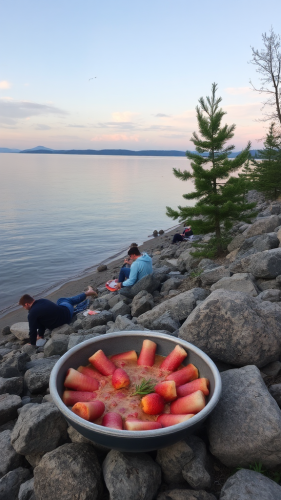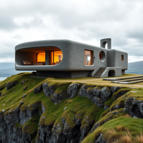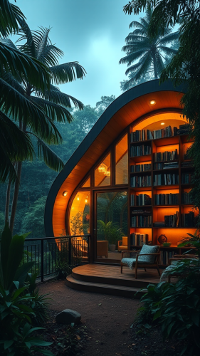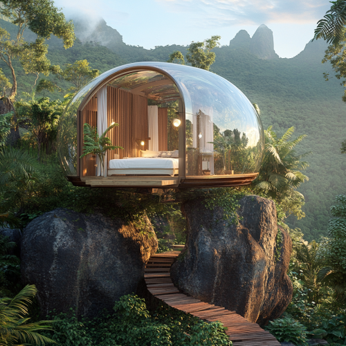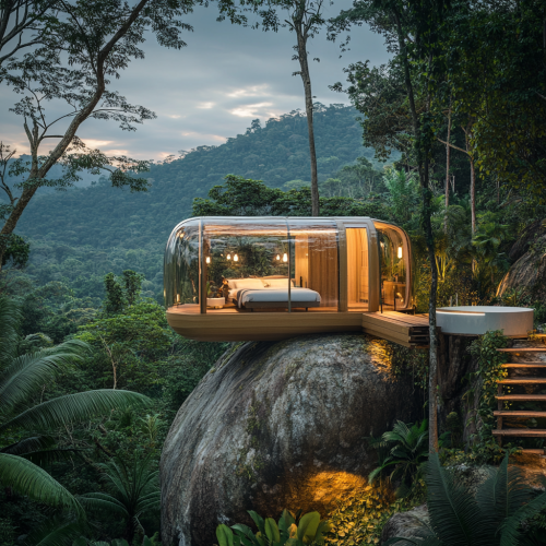 cylinder house with wood structure and polycarbonate sheets covering the entire outside so that the cylinder is transparent, sitting on top of a rock in the middle of a brazillian jungle, with mountains, the forest is thick with plants some that look exotic like ferns and palms and the rock has many suculents growing on it as well as moss, the capsule house is completly transparent, inside there is king size bed and the setup is like a 5 star hotel, there is also a mosquito net, carpet, and two pendants on each side of bed, the area outside the capsul is natural, the capsule is located on top of a giant bolder that is 4 meters tall, the capsule has a small wood path with tiny LED lights leading up to it, and small stairs that climb the rock on the side made from wood, everythere there are tiny LED lights lighting up the plants that give ambience, the capsule is located in shade but you can see the sunlight glowing through the trees, mystical ambient, it is late in the day and close to sunset, and the sky has some color, make it all realistic, real life image, the capsule house is DYI looking, and the polycarbonate sheets used are the ones from home depot that have ridges on it so the capsule is 80% transparent, the front of the capsule face has a sliding door and windows, the boulder that the capsule is sitting on is larger than the capsule so that there is space to walk around it with a small wood path, there is also a white freestanding tub about 6 meters on the front of the capsule that overlooks the view, the image is after it raind so everything is wet, the capsule should have a DYI look and be shaped like a cyliner, not rounded, there is no glass, the entire capsule is covered with polycaronate sheets with ridges like roof singlesm the frame is wood and runs [...]