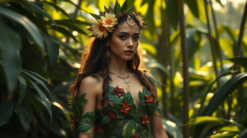 A cozy bedroom in a sprawling, industrialized jungle city with a humid subtropical climate. Rain pours outside, visible through large windows overlooking dense jungle intertwined with the city’s architecture. The cultural heritage is largely indigenous American, particularly Amazonian. The room features natural materials like woven fibers, carved wood, and vibrant handwoven textiles. Subtle, ancient symbols and bioluminescent accents create a warm, inviting atmosphere that blends the natural world with the industrial city in a timeless, harmonious way. --v 5.0