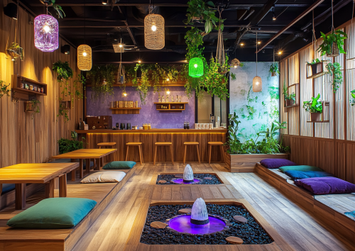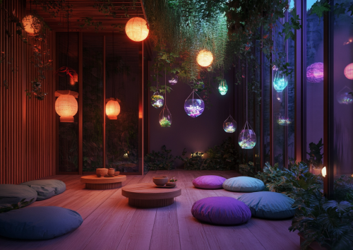 Japanese tea house with wooden interior, warmly lit, soft subtle purple blue and green lighting, ambient environment, Mushroom motifs, there are cushions on the floor and short tables. There are hanging plants inside of floating crystal pots. Relaxing and tranquil environment --ar 7:5