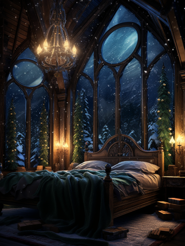 comfortable bed, magic, warm, Hogwarts style, Slytherin dormitory, snow, night, --ar 3:4