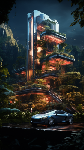 futuristic house in the jungle, with a futuristic car, in the style of contrasting lights and darks, y2k aesthetic, multilayered, eve ventrue, light cyan and brown, neon-lit urban, niko henrichon --ar 9:16