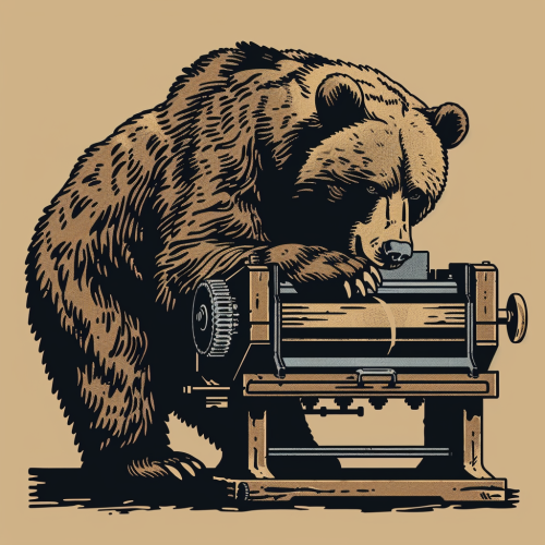 a logo for a print maker, where a grizzly bear is using a printing press