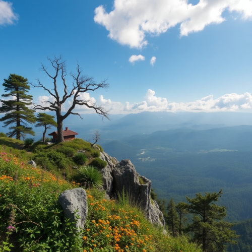 A beautiful angel with outstretched wings floating in the air, against the backdrop of mountains and trees at sunset, radiating light from behind her head. A halo around it illuminates an ethereal landscape with blue lights, and white lines of energy flow through the space around her. Realistic, with high detail, resolution, sharpness, and contrast, as well as excellent color correction, resulting in a hyperrealistic image.