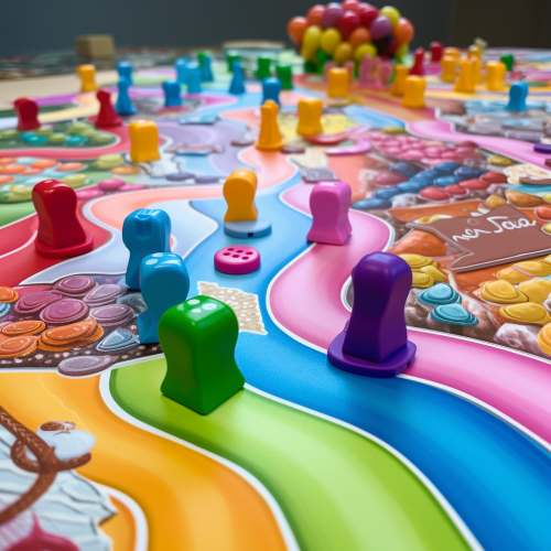A world of Catan-like hexes of cities, mountains, and forests, board game style, and fog. --ar 16:9 --s 750