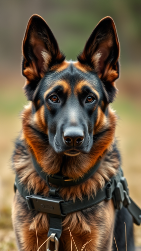 "Create a vibrant image of Chase, the German Shepherd police officer from the Dog Patrol. He should be in a command pose, with his bright dark blue uniform and gold accents. Your eyes should be large and expressive, showing confidence and leadership, with a friendly smile. Include the golden badge in your hat and your backpack full of police gadgets. Use soft shadows to give depth, with a simple background that highlights the character." --niji 6 --style raw --s 750