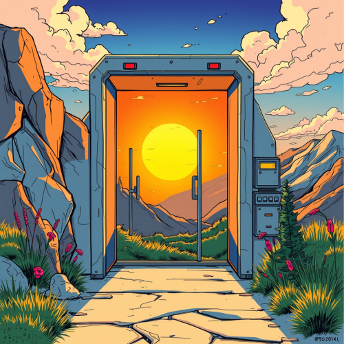 "A path stretching toward a distant mountain, guarded by three enormous robotic titans standing in formation. The middle titan, larger than the others, commands the center. The titans are clearly mechanical beings, with the mountain standing far behind them, unreachable without passing through their robotic blockade. The mountain and titans are distinct, separated by the path ahead. Berserk style --niji 6