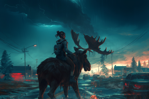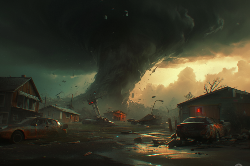 a giant tornado destroying a dark dilapidated town during a thunderstorm + horror + art style of Capullo, Brom, Whelan, aly fell rutkowski, art germ, rossdraws, and franzzeta + art station + ultra detailed + hyper realistic + 8k --ar 3:2 --niji 6