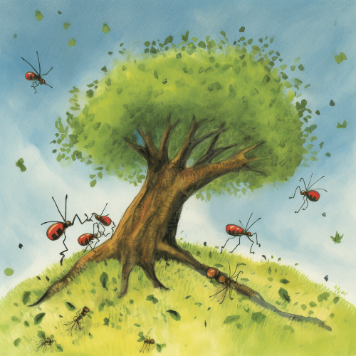3 ants in a small tornado, flying around the brench of a tree, child's book illustration, like eric_carle --v 5.0