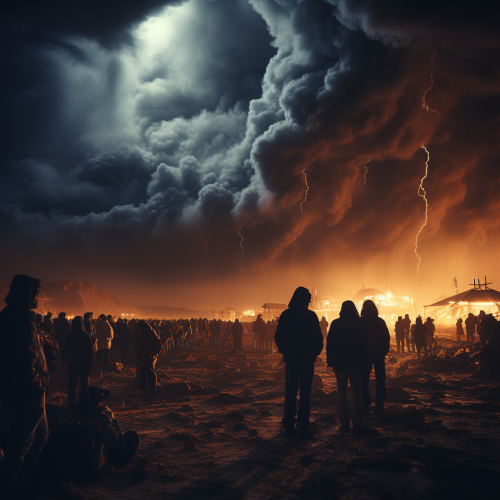 Establishing shot of the most important shamanic night dancing ceremony in front of a gigantic tornado, in the style of Janusz Kamiński and James Cameron, everybody is dancing, beautiful desert stormy night, dancing shamanic culture, powerful tornado winds, shot on 70 mm, 250 mm lens, long exposure, hyper realistic photography, matte, film grain, noise, rich colors, high contrast, long exposure, outdoor professional photography, detailed, elegant, depth of field, 24K, rendered, natural lighting, 2024 trending colors, modern colors, trendy colors, stylish colors, pantone trending colors 2024, vibrant colors, epic cinematic lighting, no blur, brightly lit, bright even lighting, bright lighting, pastel, hyper maximalist, vibrant colors, hd extremely detailed digital art, key visual, cover artwork, ultra-detailed, 32k, ultra wide angle, epic scene, epic perspective, epic composition, wide shot, cover artwork, epic cinematic lighting, very high detail, hdr, cinematic lighting, 8k, insanely detailed and intricate, elegant, ornate, hyper realistic, super detailed, intricate detail, HDR, extremely detailed, perfectionism, octane render, immersive, octane render, unreal engine 5, photoshopped, post-production, epic scene, Epic composition, epic perspective, epic cinematic lighting, photoshopped, super resolution, 12k, ultra hd, post-production, maximum detail, best image quality, --v 5.2 --chaos 10 --s 700