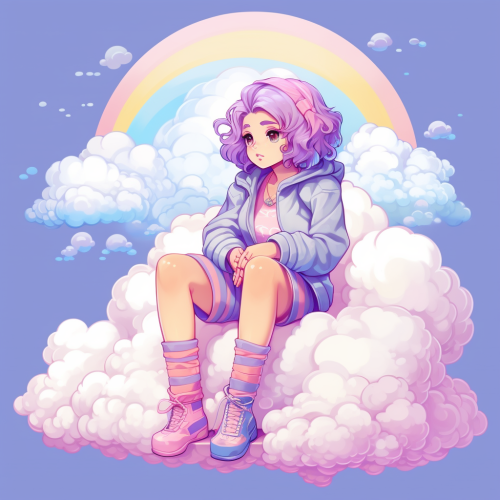 girl sitting on a rainy storm cloud in the sky, kawaii pastel rainbow palette, isometric pixel art