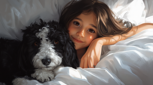 10 year old girl with brown hair and big brown eyes, cuddling with a black and whit sheepadoodle on her bed, in her bedroom, photorealistic. --ar 16:9
