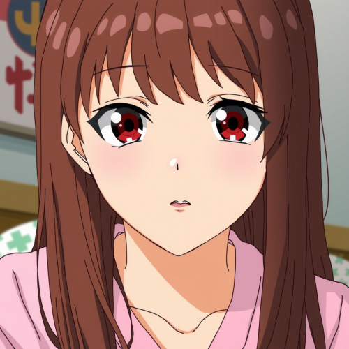 Female anime character, long brown hair, dark eyes, and fair skin. Wearing light pink pajamas