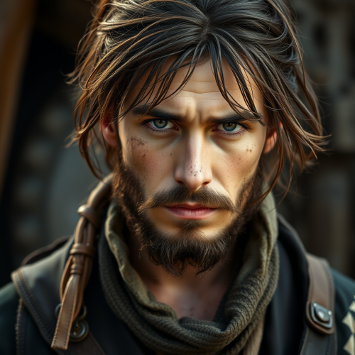 female profile picute, long messy brown hair, spiky hair ends, annoyed expression, slightly parted lips with spiky teeth, cartoony style, tan skin, black armour dress, red dress details, dark sky background, dystopian city