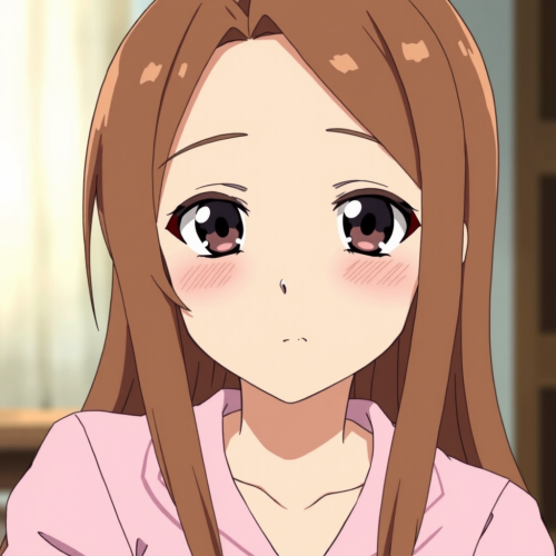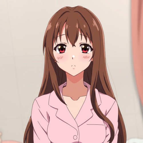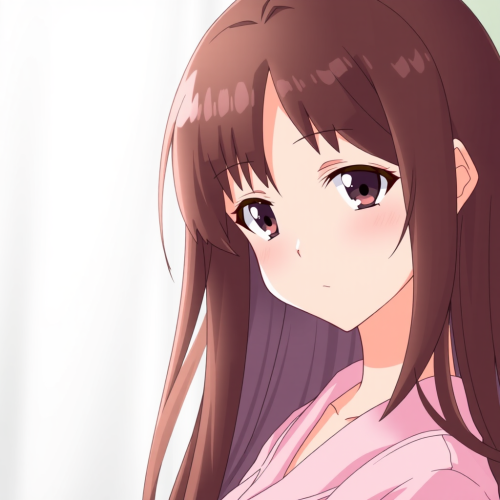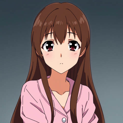 Female anime character, long brown hair, dark eyes, and fair skin. Wearing light pink pajamas. His expression is neutral.