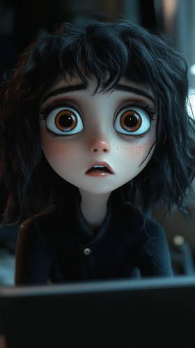 tim burton charcter , dark fantasy , girl with dark brown hair ,big brown eyes , wavy hair , spooky tim burton animation vibes , puppet animation , spooky vibes , dark theme, clay , working with a laptop --ar 9:16