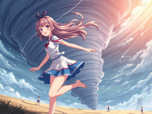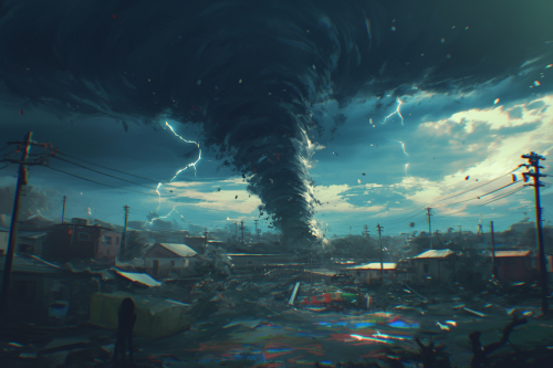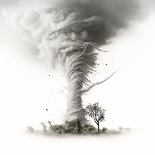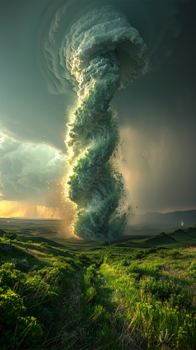 An electric lime tornado twists and turns through an absinthe-colored field, its path marked by vibrant destruction and chaotic beauty. The contrast between the tornado's eerie light and the dark green field captures the terrifying allure of nature's force. --ar 9:16 --v 6.0 --s 750 --style raw