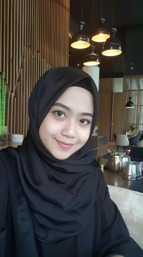 Phone photo selfie of attractive girl on our first date, dinner, Jakarta, day time, posted on snapchat, hijab, casual hijab --ar 9:16 --stylize 50 --v 6.0 --style raw