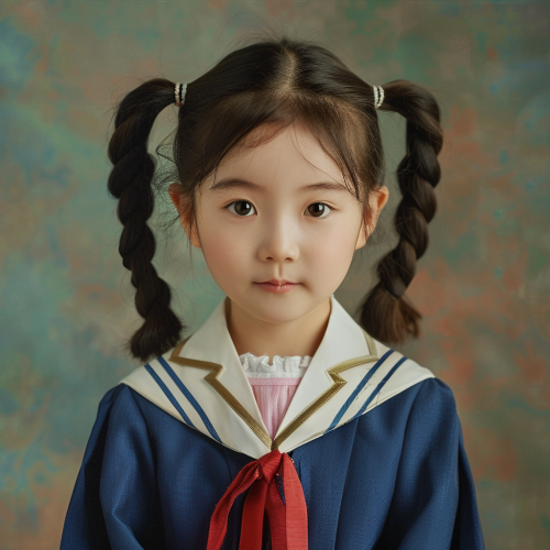 A six-year-old Korean with dark brown pigtails is wearing a graduation suit.