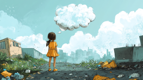 A young girl standing in a street full of trash, looking out at a dirty city; she imagines herself running through green meadows, represented in a thought bubble above her, in a dreamy and contrasting style, cartoon --ar 16:9