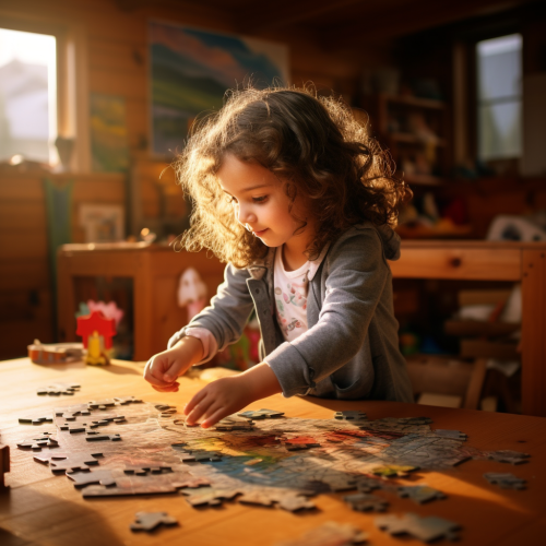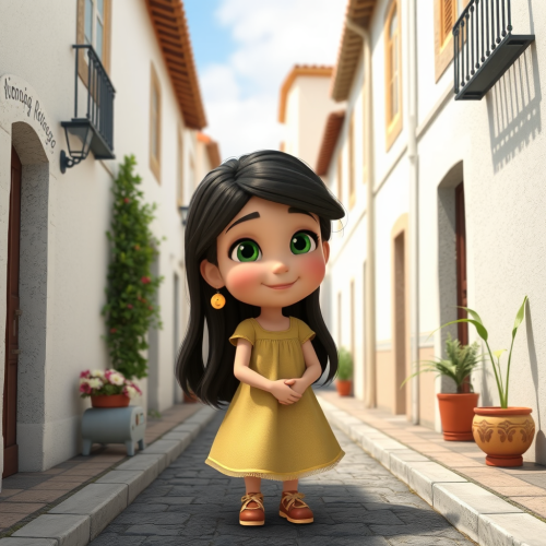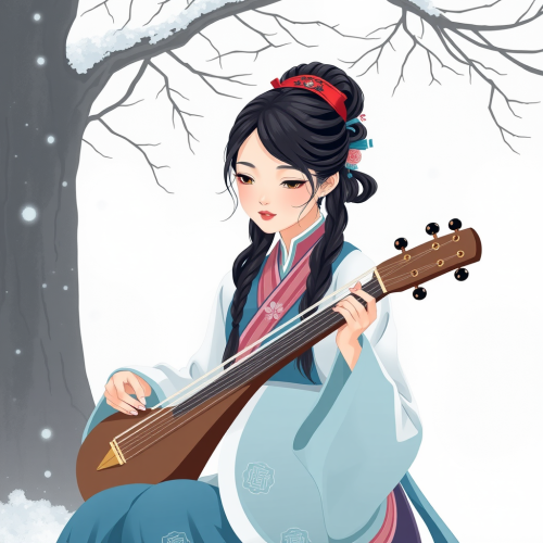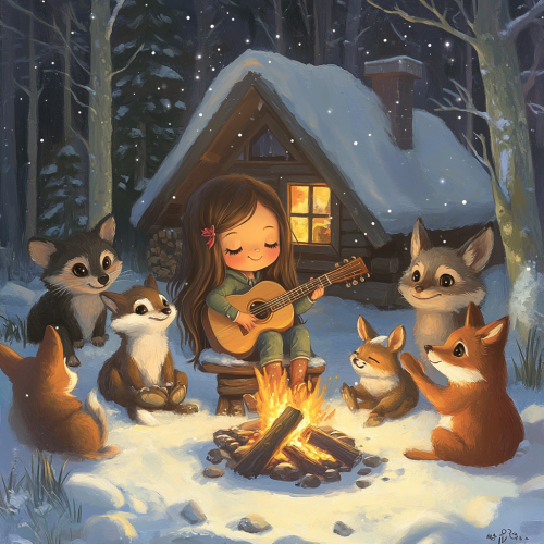 a campfire scene in a mountain setting, a little girl with very long dark brown hair and big brown cat eyes plays her guitar, he woodland friends, bunny, raccoon, fox, deer, wolf, owl and bear are around her enjoying her music, in the background is a quaint a-frame wooden cabin, there’s snow on the ground and a pair of skis standing up leaning on the house.