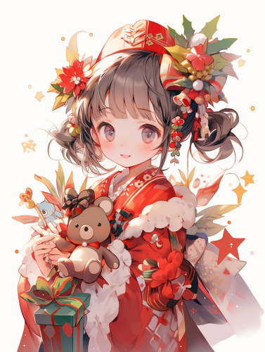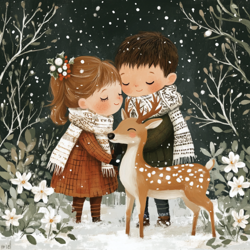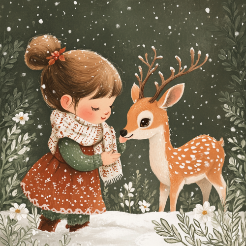 A cute little girl and a deer in the snow, surrounded by greenery and white flowers, wearing scarves with patterns on their necks, in the style of hand-painted, with cute Christmas elements around them, with high-definition details. --v 6.1