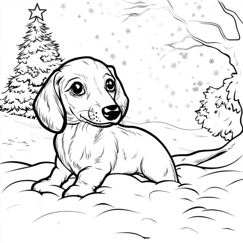 coloring book page, simple line art, minimalistic, white background with only outlines, dachshund with long ears and long body playing in the snow with a white christmas tree in the background, black and white only, no shading, high depth of field, 8k