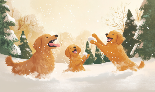 illustration of Golden Retrievers throwing snowballs at other in the park having great fun, surrounded by Christmas trees, drawn in the style of Oliver Jeffers, soft light, pastel colors, Christmas theme, childrens book illustation --ar 5:3 --v 6.1