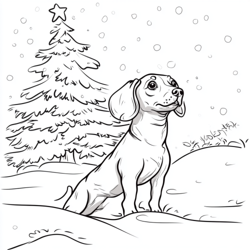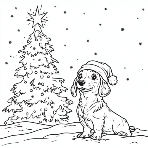 coloring book page, simple line art, minimalistic, white background with only outlines, happy dachshund wearing christmas hat andplaying in the snow with a white christmas tree in the background that has a large star on top, black and white only, no shading, high depth of field, 8k