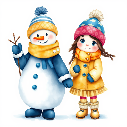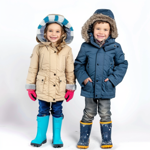 stock image of a happy child boy and girl wearing winter clothes. The girl is wearing a coat and jacket and rubber boots, the boy is wearing a coat and jacket and rubber boots. white background --ar 1:1 --v 6.0 --style raw --s 50