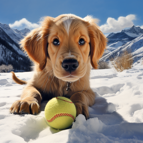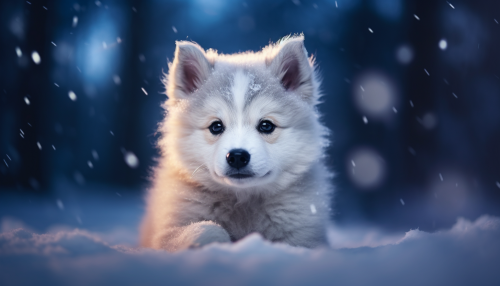 a cute puppy playing in the snow in the night, blurred background of snow falling, snow on the ground , winter sceance --ar 7:4 --v 5.2