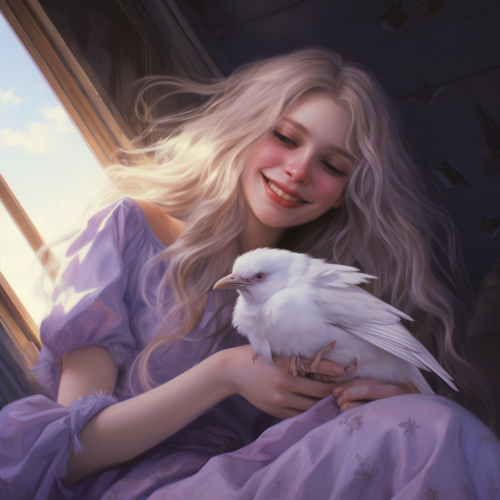 a girl with white clothes, a purple bird is resting on her arm, a big smile on her face,blush, and long white hair