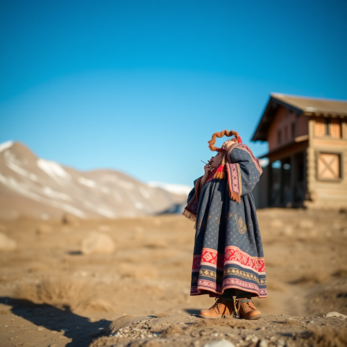 create one girl wearing nightdress inspired chungsam, with long flowing black hair, evil smile, positioned on blackmailing posture as if l she's a rouge thug. Create a black silhouette of a man in front of the girl, without any description, as if he is an extra, situate the girl within Abandoned ruins in the desert, natural sun light. The perspective view should be a low-angle view that compelling to the girl --ar 16:9 --niji 6 --stylize 750