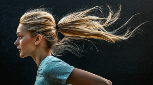 A girl runs, plays sports, her hair is completely visible, her hair color is blond, her hair is in a ponytail, the background color is black --ar 16:9