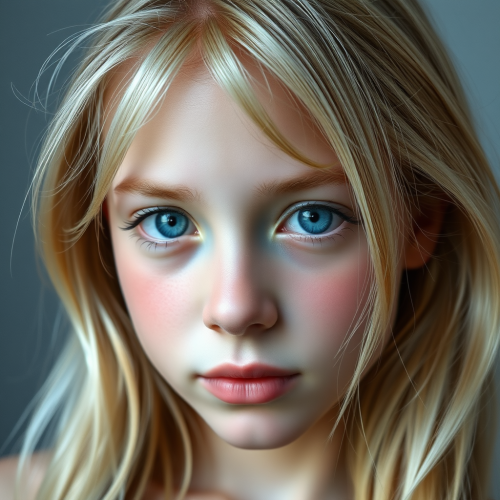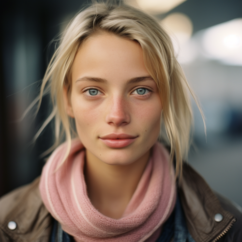 A blond German girl with thin hair brushed straight, parted in the middle looking up with a shy smile wearing a little jean jacket and pink scarf. She has a narrow face, narrow jawline, high hair line, narrow nose, thin eye brows and very thin lips lots of light, boldly textured leica m6 50mm f1.8 lens